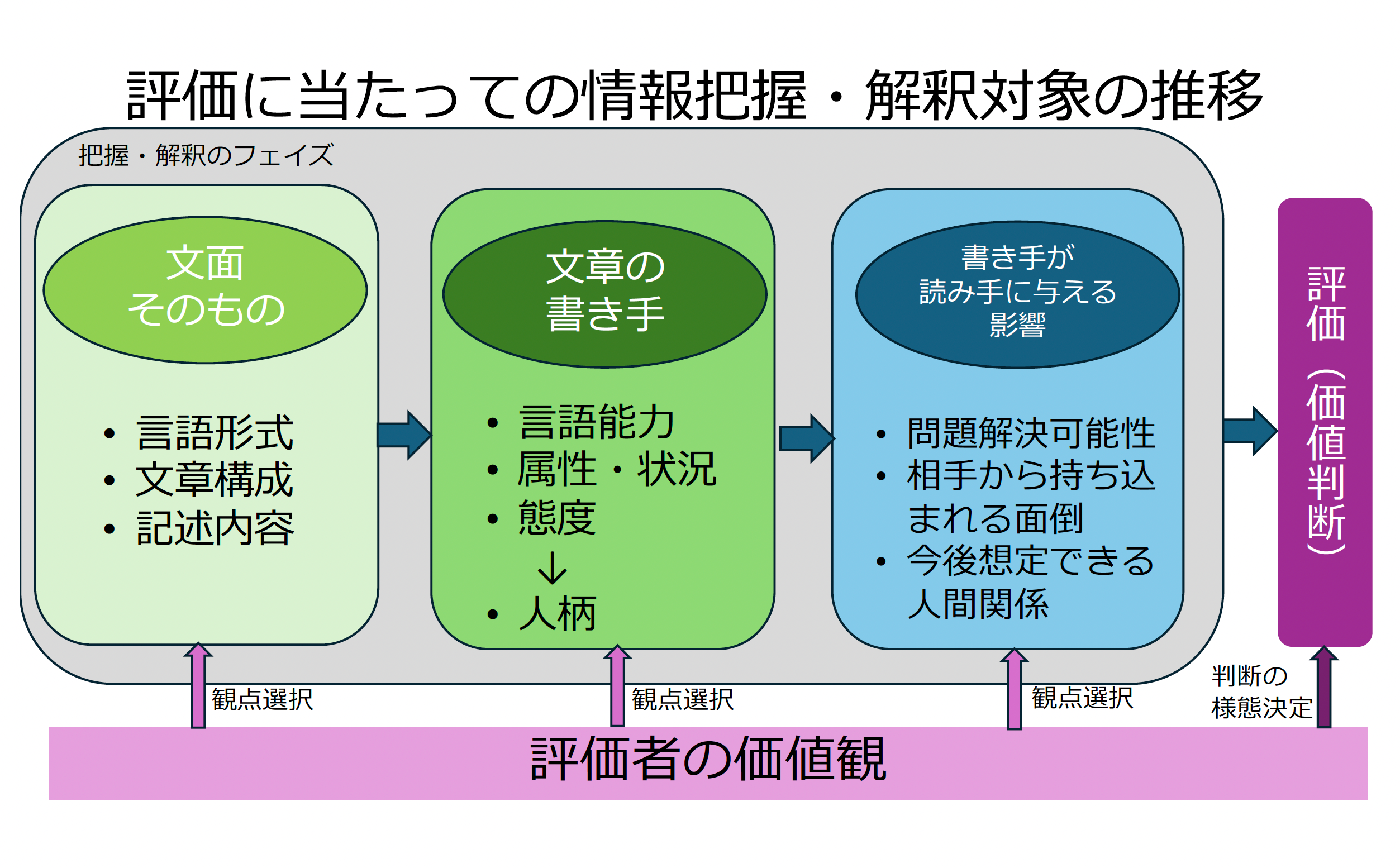 博士論文をまとめた書籍『「非母語話者の日本語」は、どのように評価されているか』(2014年、ココ出版より刊行)では、日本語を母語としない人が書いた謝罪文を、日本語母語話者がどのように評価しているか(どういう観点を、どういう順番で見ているか、ある観点を見る際にどういう価値を重視しているか)を詳細に検討し、同じ日本語母語話者であっても評価において準拠する価値観や評価のプロセスは大きく異なること、そうしたプロセスは一見多様に見えても、その裏には共通の原理も存在していることを示すとともに、そうしたプロセスの多様性と共通性をともに表現できる「評価プロセスモデル」を提案しました。このモデルは、自分自身がどのようなプロセスで評価を行っているかを内省するための手がかりとして非常に有効なものと考えられます。
