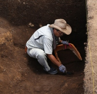 東アジアの視点から古墳を造営した社会構造を解明することを目指しています。(写真は、発掘作業風景)